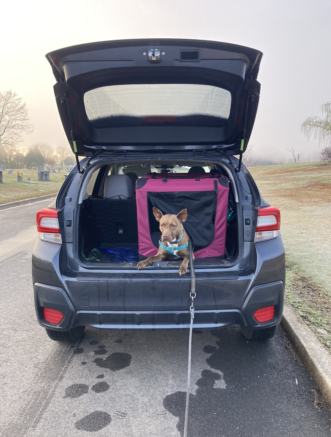 Using a car crate so Lady couldn’t see dogs out the car window