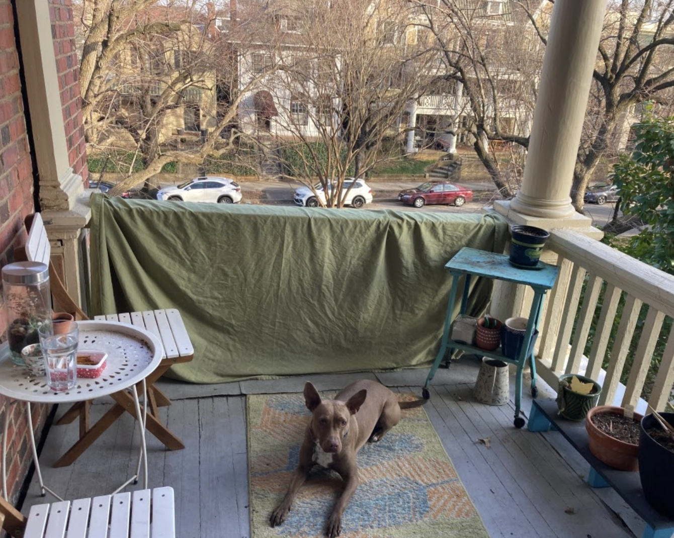 Draping a sheet over our balcony railing so she couldn’t react to dogs walking down the street